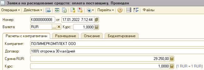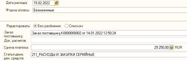 Остановлюсь в Заявке на расходование на важном поле – Заказ поставщику.