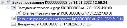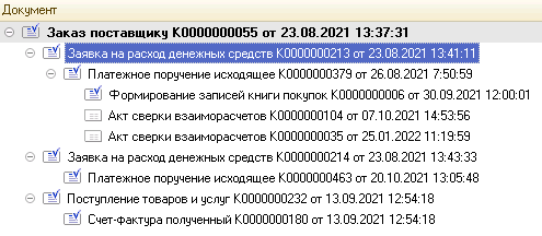 К Заказу привязана не только Заявка на расходование, одна и вторая, а также платежные поручения, документ поступления, счёт-фактура.