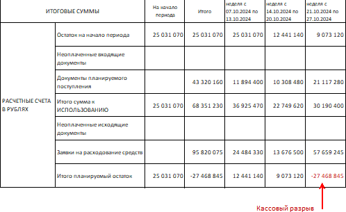 В календаре виден кассовый разрыв 27 миллионов, он возникает на неделе с 21 октября. И у нас есть время, чтобы его предотвратить.