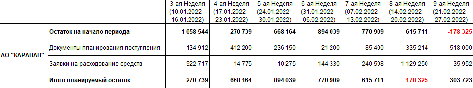 Вот более простой пример платежного календаря. Также понедельно анализируем планируемые приходы и расходы, замечаем, когда возникает кассовый разрыв.