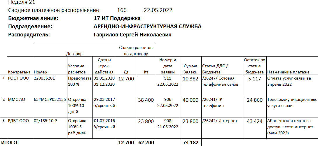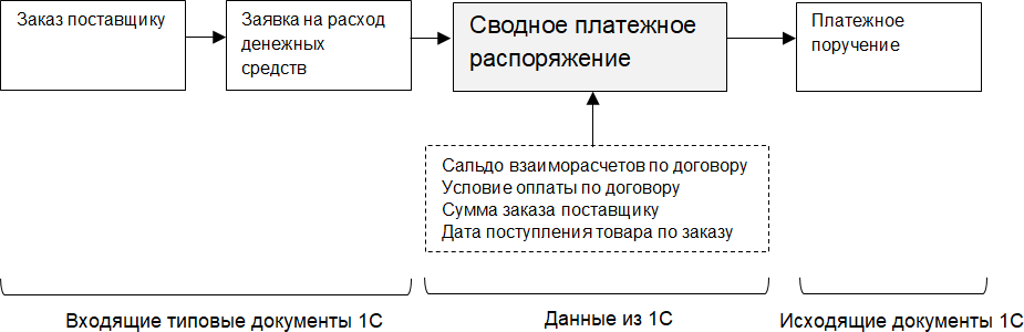 Сводное платежное распоряжение (СПР) формируется из заявок на расходование денежных средств, из данных 1С по взаиморасчетам с контрагентом, по условиям договоров. Для чего этот документ? Если платежей довольно много, хотя бы 20–30 в день, то мне как финансовому директору придется потратить много времени чтобы рассмотреть и согласовать такую россыпь заявок, никак не сгруппированных. Поэтому я оформлять СПР на основании заявок одной бюджетной линии. Такого документа нет в типовой конфигурации, но он очень удобен, поэтому я добавляю его в систему на каждом своем проекте.