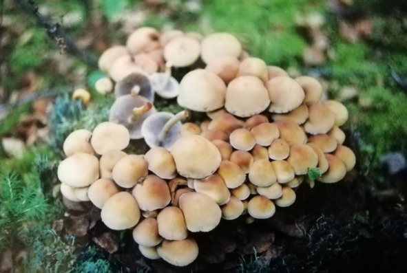 Ложноопенок Кандоля попадался мне на почти полностью сгнивших пнях большими (до сотни штук), очень плотными группами. Небольшие (5—6 см) выпуклые, округлые, без бугорков шляпки окрашены ровно. Чуть светлее выглядят только самые краешки – там остаются мелкие кусочки белого покрывала. Цвет описать очень сложно – и не желтый, и не коричневатый, но и не розоватый, как иногда на рисунках, а скорее смесь этих оттенков. С пластинками проще. Они серые с фиолетовым или сиреневым отливом. Ножка тонкая, полая, немного светлее шляпки.