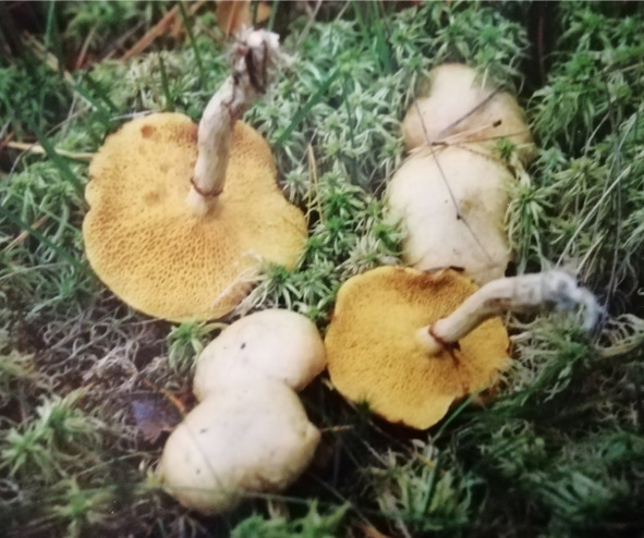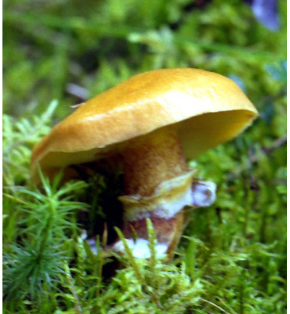 Вот эти три вида только что описанных маслят и становились, время от времени, моей добычей до 14 июля 1998 года, когда в еловой посадке мне повстречался небольшой длинноногий трубчатый гриб. Шляпка его была ярко-желтой, того же цвета ножка отливала краснотой, желтоватая пленка полностью скрывала очень мелкопористый, лимонно-желтый трубчатый слой.