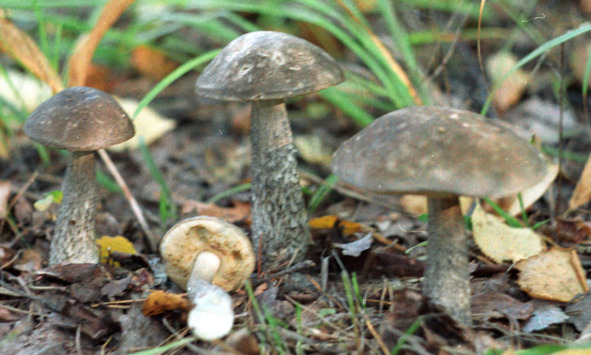 Подберезовик бархатистый или чернеющий иногда весь одноцветный – коричневато-желтый, но встречается и с темно-коричневой шляпкой. Ножки, покрытые мелкими чешуйками, даже у молодых грибов тонкими не бывают, поэтому самые мелкие грибы напоминают желуди – шляпки хоть и не прижимаются краями к слегка вздутым ножкам, но не сильно отличаются от них диаметром. С возрастом ножки вытягиваются, чешуйки становятся почти незаметными, шляпки разрастаются, но остаются выпуклыми и слегка бархатистыми (шершавыми). Из-за довольно толстых плотных ножек и очень темных шляпок можно принять их за подберезовики черные. Однако отличие очень явное – у черного срез слегка синеет, а у бархатистого — чернеет.