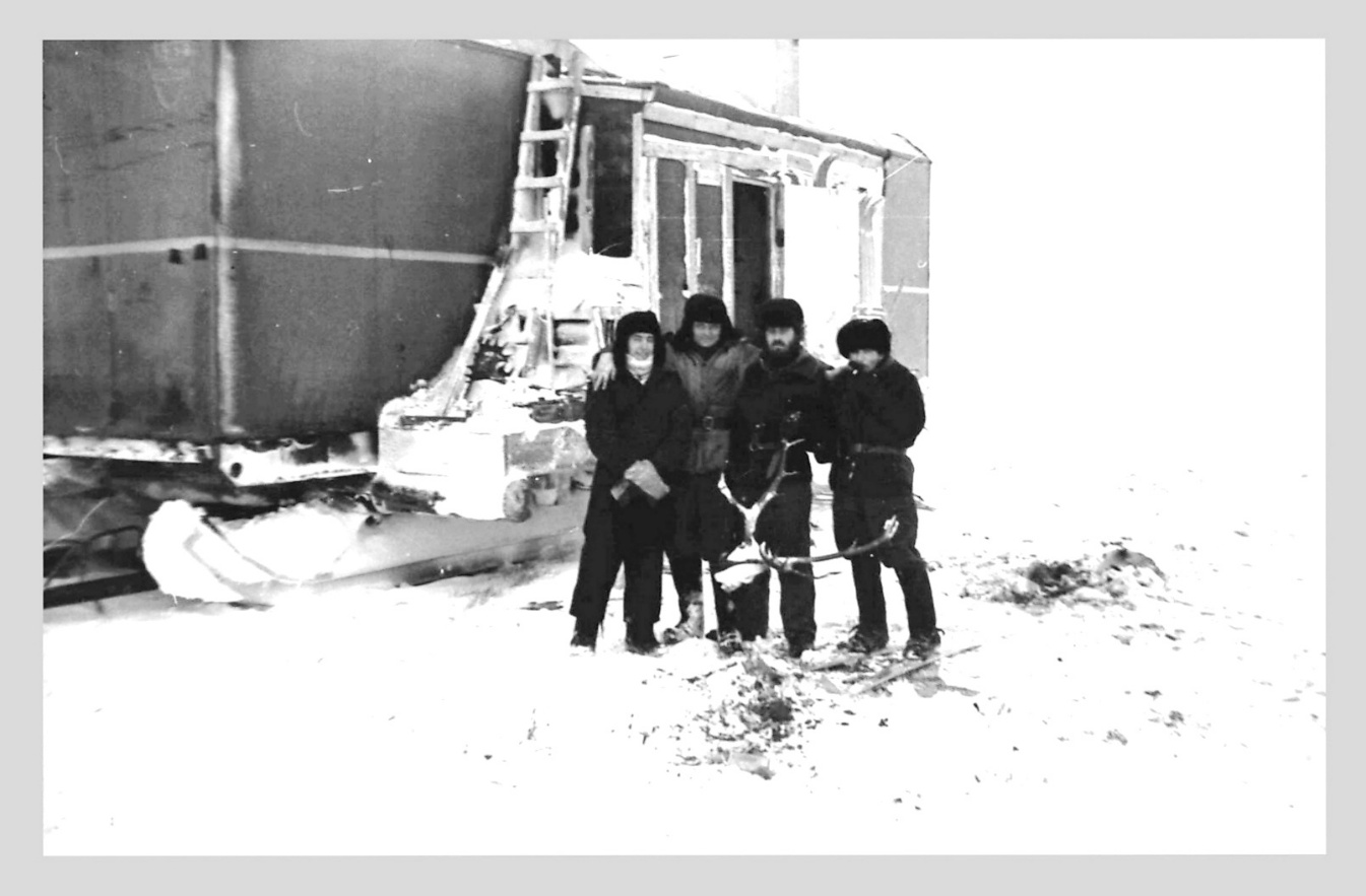 На фотографии запечатлён Дудинский Топографический отряд – Таймырской Геофизической Экспедиции на фоне Центрального Универсального Балка (ЦУБ), в составе участников, слева-направо: Дуров, Тарасов, Лукошенко и Соболенко. Заполярная тундра, 1982 год.