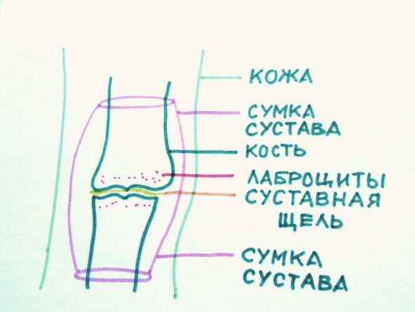 Сустав обвязан очень крепкими тканями, называемыми связками. Под связками эластичная сумка. При сгибании колена сумка растягивается. Вверху сумка начинается от нижней трети бедра. Внутри сумки суставная жидкость. Поверхность костей, соприкасающихся друг с другом выстланы хрящем. Глубоко под этим хрящем находятся клетки, называемые лаброциты. Именно они отвечают за обновление хряща соприкасаемых поверхностей и именно они отравляют хрящ при болезни (см. раздел «4. Причины артроза»).