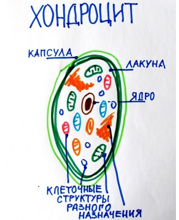 Хондроцит. Это он производит межклеточное вещество. О нем мы вспомним, когда будем писать о гиалуроновой кислоте. Хондроциты и гиалуроновая кислота тесно связаны, как недавно в нашей истории были связаны вождь и партия. Хотя структурно это совершенно разное.
