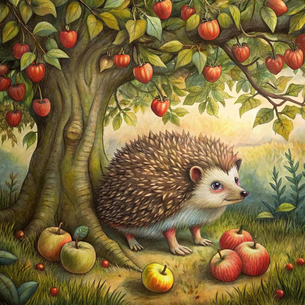 Она была высокой и раскидистой, а её ветви были усыпаны маленькими зелёными яблочками. Возле этой яблони жил маленький ёжик по имени Шуршик. Он был очень любопытным и любил изучать всё вокруг. Каждое утро Шуршик выходил из своей норки и наблюдал за тем, как яблоня растит свои плоды. Яблочки сначала были крошечными, зелёными и кисленькими.