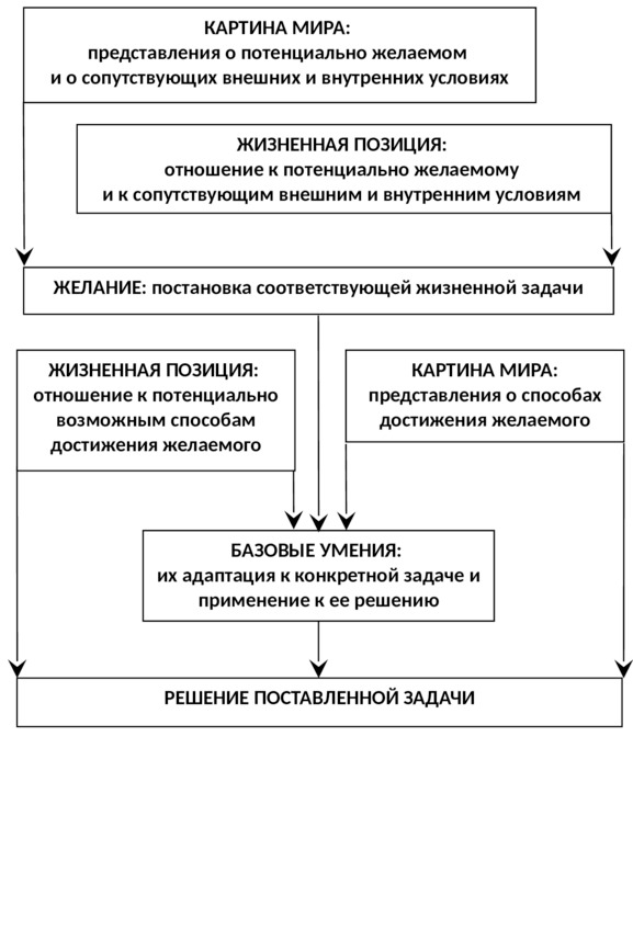 Итак, человек как-то представляет себе окружающий мир, чего-то в нем хочет и какими-то способами пытается желаемого добиться. То, как человек представляет себе окружающий мир, мы обозначили понятием картины мира; то, на основе чего он выбирает желаемое – понятием жизненной позиции; то, какими способами он этого добивается – понятием базовых умений.