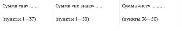 На высказанные утверждения можно дать три типа ответов – «да», «нет» или «не знаю». Впиши нужный ответ прямо в приведенную выше таблицу из 50 утверждений и подсчитай свои баллы. Теперь подсчитай количество «да» в пунктах с 1-го по 37-й включительно. Запомни полученное число! Подсчитай также количество ответов «нет» в пунктах с 38-го по 50-й включительно. Полученное второе число также запомни, а лучше запиши на листке бумаги или прямо в анкете. Подсчитай и ответы «не знаю» во всех пунктах с 1-го по 50-й. Тогда ты получишь и третье число. Каждое из трех полученных чисел раздели на два и сложи три полученных результата. Окончательный результат сравни с приводимой ниже психодиагностической шкалой.