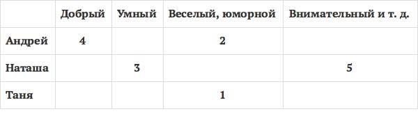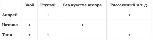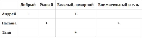 Потом берется лист бумаги, сверху в линеечку перечисляются положительные качества. Слева в столбик пишутся имена «тестируемых». Понятно, что все это для наглядности еще и разлиновывается – как вертикально, так и горизонтально. Потом на этом же самом листке опять горизонтально перечисляются отрицательные (на твой взгляд) качества и снова, но уже вертикально, пишутся те же имена. Потом крестиками отмечаются и те и другие качества одного и того же лица, но чернилами (фломастером) разного цвета, например положительные – красным, отрицательные – синим. Получится примерно так.