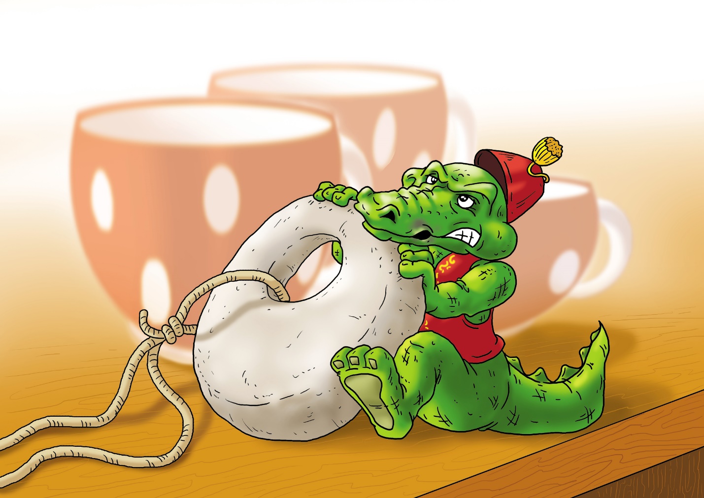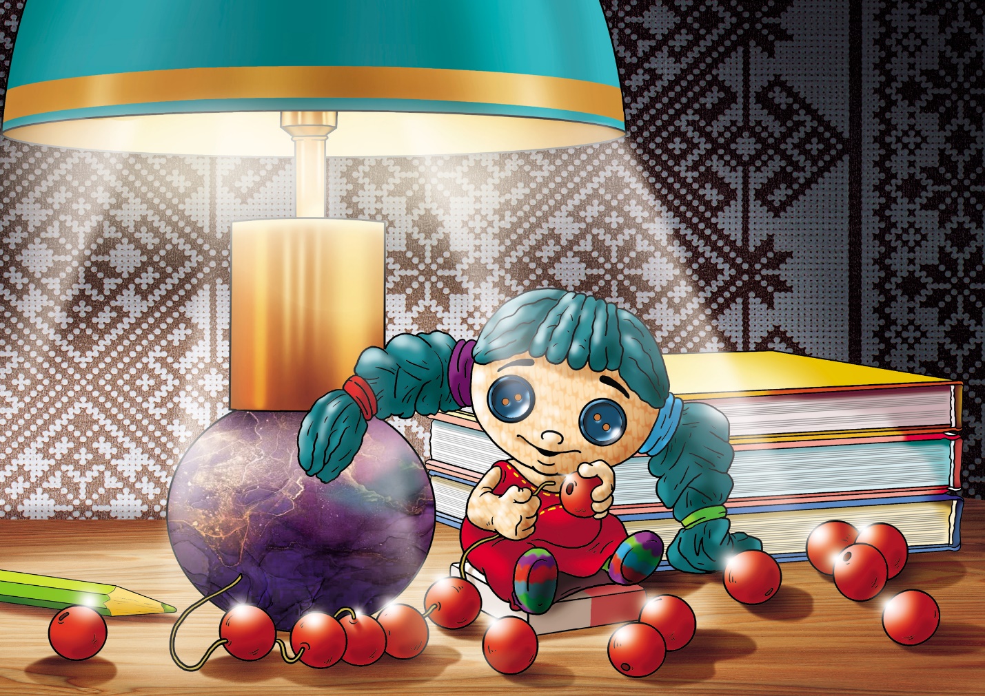 У В́арюшки закончились все яркие бусины-ягодки, и она растерянно держала в руках нить, не зная, что делать дальше, ведь завязать крепкие узелки её мягкими вязаными руками вряд ли бы удалось. Видя замешательство куклы, вредный Крокодилыч, позабытый на пыльной полке серванта, вдруг разразился бурной руладой: