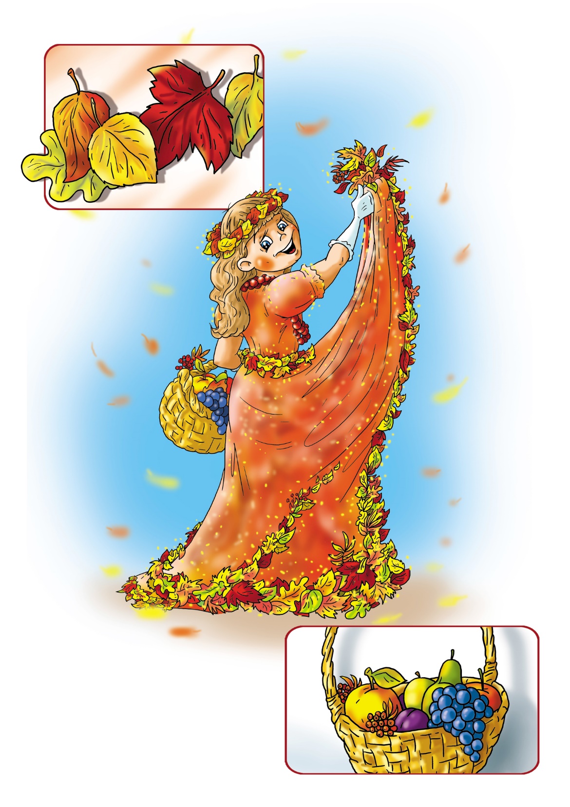 Осенний наряд готовился целую неделю. Бабушка пожертвовала для бального костюма огромную тюлевую занавесь, которую кроили, сшивали, красили в жёлтые, оранжевые и пурпурные цвета. Твёрдые накрахмаленные юбки придавали платью поистине царский вид. Решено было пустить по подолу осенние листья. Вечерами Оля вырезала из бумаги и раскрашивала кленовые бордовые и золотистые берёзовые листики, а Варюшка нанизывала длинную нить из ярко-красных бусин, напоминающих ягоды рябины.