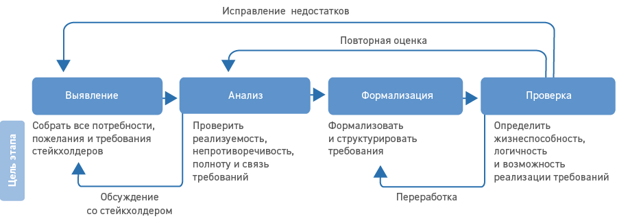 Процесс работы с требованиями осуществляется поэтапно. С некоторыми оговорками. В реальности требования постоянно корректируются и изменяются. Иногда приходится возвращаться на предыдущие этапы, чтобы уточнить смысл требования. Иначе реализация требования не приведет к желаемому результату.
