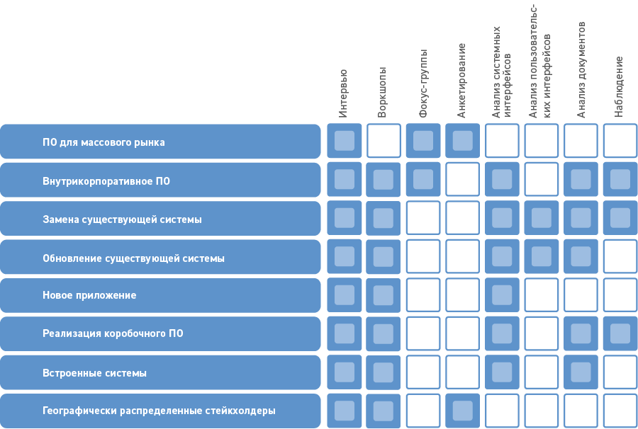 В матрице собраны методы выявления требований для разных типов проектов разработки.