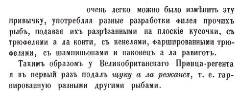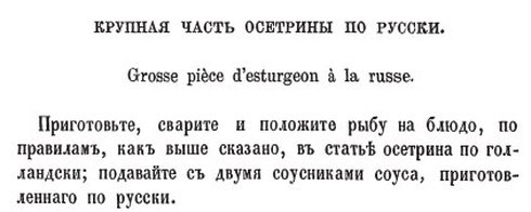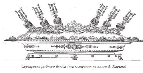 То есть сделайте все по-голландски, а потом просто полейте русским соусом. Кстати, чтобы понять удельный вес русских блюд в творчестве этого кулинара, достаточно сказать, что во всем втором томе его сочинений (посвященном горячим рыбным блюдам) приведенный выше рецепт – единственный, где содержатся эпитеты «русский» или «по-русски». Все остальное – «по-венециански», «по-английски», «по-антверпенски». Не говоря уже о бесконечных «а-ля Перигор», «а-ля Генрих IV», «а-ля Сюлли» и т. п. Так что значение русской кухни в жизни Карема даже при всех известных нам обстоятельствах вряд ли стоит переоценивать.