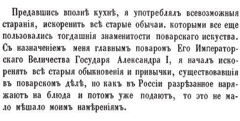 Но, пожалуй, помимо всех специфически кулинарных вещей, есть у А. Карема и еще одна заслуга перед мировой и особенно русской кулинарией. Она связана с ролью повара и оценкой его окружающими. Даже во Франции известные повара чувствовали определенный дискомфорт. «В то время как престиж французских шеф-поваров постоянно увеличивался, достигая уровня подлинных артистов, их социальный статус до самой революции (1793 года. – Прим. авторов.) оставался тем же – слуги»[167]. Это мнение американского исследователя Пола Мецнера удивительно точно отражает социальный и профессиональный конфликт, назревший к тому времени.