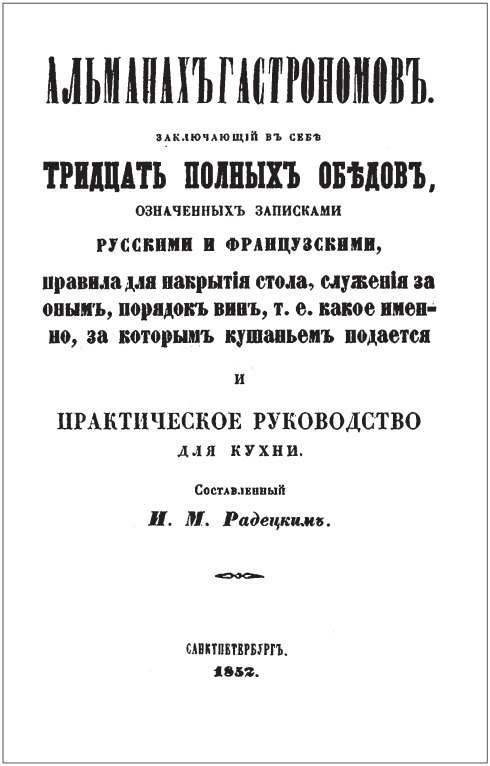 И. М. Радецкий – бывший метрдотель двора его императорского высочества герцога Максимилиана Лейхтенбергского[171], Санкт-Петербургского дворянского собрания, семей Паскевича и Витгенштейна, автор трехтомной книги «Альманах гастрономов», вышедшей в 1852–1855 годах. Книга была рассчитана на читателей разного достатка, в ней содержались рецепты от каш для грудных младенцев до паштетов из фазанов и индеек. Для всех блюд были рассчитаны цены и количество продуктов в зависимости от ожидаемого количества персон. Автор предлагал читателям варианты оптимизации и сокращения расходов за счет создания запасов на зиму, приводил сравнительную таблицу цен на продукты в зависимости от рынков, на которых эти продукты продаются. И. М. Радецким также выпущены книги «Хозяйка, или полнейшее руководство к сокращению домашних расходов, с указанием стоимости каждого блюда» и «Санкт-Петербургская кухня» (1862).