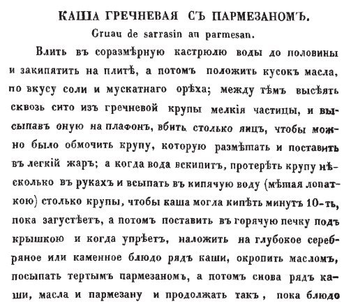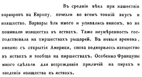 «В Санкт-Петербурге поваренные книги издавались книгопродавцами в переводах с французского или… выбирались блюда из других поваренных книг… Гостеприимная Москва дарила Россию ежегодно описанием вкусных и лакомых яств своих коренных хлебосолов. Московские поваренные книги составлялись в начале русскими поварами, а впоследствии хозяйками более для провинций. Но Санкт-Петербургский житель смотрел недоверчиво на советы отличного русского кухмистера или опытную хозяйку… в короткое время французская кухня стала общею… Наконец, приготовление иноземных яств пресытило людей. Обратились к национальному»[170].