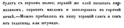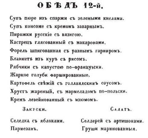 Как видите, здесь нет бездумного перечисления иностранных блюд, смысл которых, как и перевод, порой просто ускользал от неискушенного читателя. Это такая небанальная комбинация кушаний двух народов, яркий антипод «смеси французского с нижегородским», которую высмеивал классик. Действительно, достаточно пройтись по страницам «Альманаха…», посвященным ежедневным перечням блюд, как станет понятно: перед нами творческая и весьма искусная попытка соединить в себе две национальные кулинарии. При этом попытка не игнорирующая, а всячески подчеркивающая и использующая положительные стороны каждой кухни. Вот, например, чем не образчик подобной толерантности: