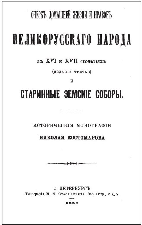 Костомарова часто называют замечательным историком-художником, и это совершенно верно. Художественность эта, помимо присущей ученому образности изображения, достигалась богатым иллюстрированием повествования выдержками из источников. А ведь сила и доказательность старинных текстов в тысячу раз выше любых сегодняшних рассуждений. Читайте, читайте старые книги. Это действительно ни с чем не сравнимое удовольствие. Удовольствие общения с людьми, которые говорят с тобой через десятки и сотни прошедших лет.