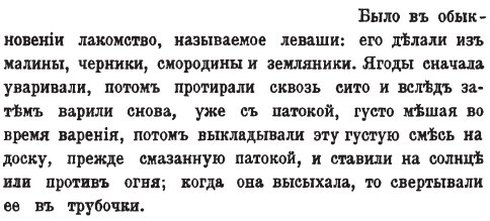 Сравните, кстати говоря, с цитатой из В. Похлебкина: «В XIV–XV веках возникает и другое русское национальное сладкое изделие – левишники, приготовляемые из тщательно протертых ягод брусники, черники, вишни или земляники, высушенные тонким слоем на солнце»[216]. У Костомарова несколько понятнее, о чем идет речь, не правда ли? Помимо этого, Похлебкин, без особых на то оснований, сдвинул появление блюда на 200 лет назад. Между тем оригинальный текст Костомарова взят из книги, которая называлась «Очерк домашней жизни и нравов русского народа в XVI и XVII столетиях»[217] (курсив наш. – Авт.). У нас нет причин упрекать В. Похлебкина в неточности: кто знает, может, и в XIV веке такая еда была. Не видим препятствий к тому, чтобы она существовала и в домонгольский период. Нет здесь каких-то новых технологий, не существовавших и 500, и 800 лет назад. Это мы просто к вопросу о точности датировок нашей кулинарии и авторитетных научных мнениях. Которых ровно столько же, сколько и самих авторитетных ученых.