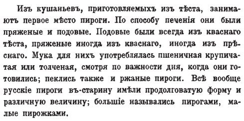 Вообще, в «Очерке…» содержится подробный обзор всех направлений русской кухни. Порядок их описания практически совпадает с порядком подачи блюд за столом. Сначала, как водится, пироги и закуски: