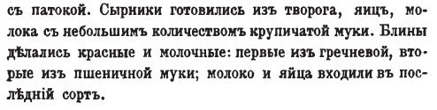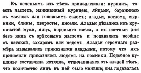 Частенько Костомаров пользуется в качестве источника знакомым нам «Домостроем». Если помните, там дается следующий перечень великопостных блюд: «Лапша гороховая, пшено с маковым маслом, целый горох да горох лущеный, двойные щи, блины, да луковники, да левашники, да пироги подовые с маком, да кисели, и сладкие и пресные. А сладкое – в какие дни доведется: ломти арбуза и дынь в патоке, яблоки в патоке, груши в патоке, вишни, мазуни с имбирем, с шафраном, с перцем, патока с имбирем, с шафраном, с перцем, напитки медовые и квасные, простые с изюмом да с пшеном, шишки, пастила из различных ягод, редька в патоке».