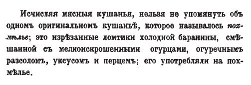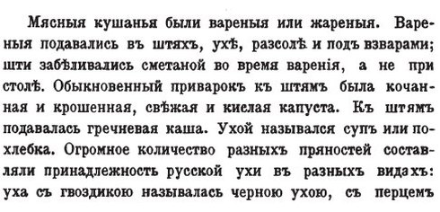 Весьма любопытны замечания Костомарова относительно первых, особенно рыбных блюд. Если помните, в одной из предыдущих глав мы подробно останавливались на рыбных блюдах в русской кухне, стараясь при этом основываться на источниках XVI–XVII века. И лишь одна цитата, наверняка запомнившаяся вам, была из Костомарова: «Взяв в руки рыбу, русский подносил ее к носу и пробовал: достаточно ли она воняет, и если в ней вони было мало, то клал и говорил: еще не поспела!» Трудно сказать, была ли это гипербола автора, но в целом его отношение к русской кухне оставалось достаточно трезвым.