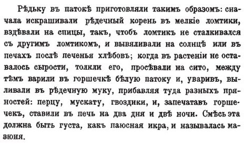 Что такое «редька в патоке», мы можем в подробностях узнать в «Очерке…». Обратите внимание, это практически полноценный рецепт. По крайней мере, так, как его понимали в середине XVII века, – не детальная технологическая карта (сколько ложек, грамм, минут и т. п.), а подробное описание процесса, особенностей технологии.