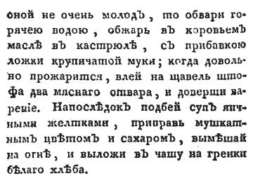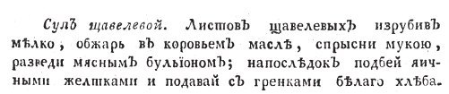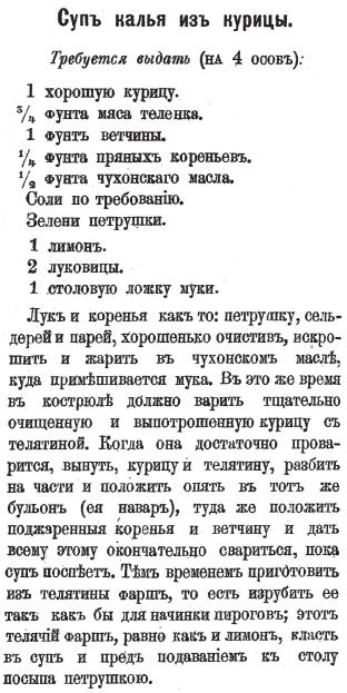 Несколько ближе к современной, версия этого супа представлена в изданной в 1808 году в Москве книге «Поваренный календарь, или Самоучитель поваренного искусства». Хотя общих черт достаточно:
