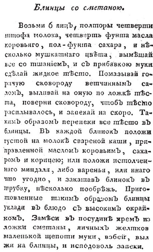 Блинцы со сметанойПрежде чем выбрать то или иное блюдо, мы обычно пересматриваем десятки старинных рецептов. И когда вдруг увидели этот – нахлынули воспоминания: «блинцы», а не «блинчики» говорили наши бабушки. Еще в начале прошлого века живо было именно это слово, обозначающее «тоненькие, ажурные блинчики». Но сначала – цитата из первоисточника. Это «Поваренный календарь» 1808 года: