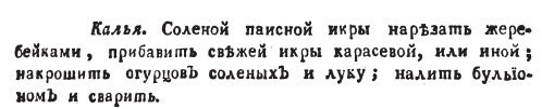 КальяНазвание этого супа уже хорошо подзабыто. Многие никогда раньше не только не ели, но даже и не слышали о нем. Как объясняет нам Толковый словарь Даля, «калья – это род борща, похлебка на огуречном рассоле, с огурцами, со свеклой и с мясом, а в пост с рыбой и икрой; похлебка из икры с солеными огурцами». Блюдо настолько давнее, что даже «Словарь поваренный, приспешничий…» (1795) приводит лишь очень схематичный рецепт: подразумевалось, что он всем известен.
