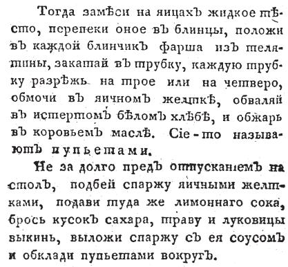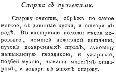 Спаржа с пупьетамиНу и словечко! Трудно даже вообразить, что это такое. Особенно интересно наблюдать за реакцией гостей, впервые услышавших название блюда. Между тем это рецепт из книги «Поваренный календарь, или Самоучитель поваренного искусства», изданной в Санкт-Петербурге в 1808 году: