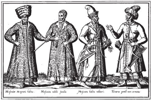 Одежда русских и татар в XVII веке (из книги Д. А. Ровинского «Материалы для русской иконографии», вып. 6, СПб., 1888 год). Перевод надписей под изображениями: Одеяние московского магната, Знатный московит, Московит в воинском одеянии, Татарин в своем туземном вооружении