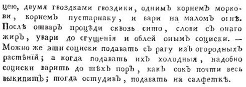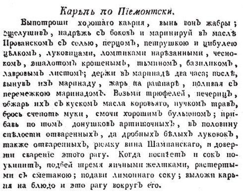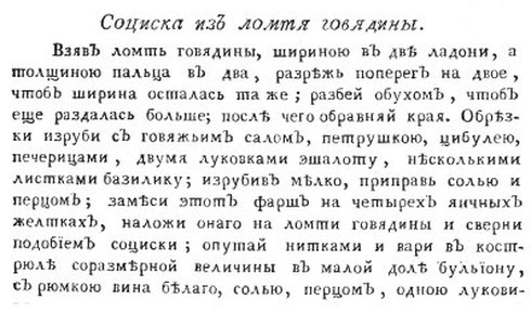 Между тем А. Терещенко более благосклонен к русской кухне: «Теперь за этим не отправляются туда (в Париж. – Примеч. авторов): искусство поваренное стоит у нас на высшей степени усовершенствования». Думается, что он более близок к правде жизни. Мы, естественно, не о «высшей степени» искусства, а о вкладе русских поваров в общую картину гастрономической жизни России. В качестве иллюстрации этого тезиса хотелось бы продемонстрировать рецепт одного такого «иностранного» блюда[103] и задать вопрос: «Вы верите, что это готовил французский повар?»