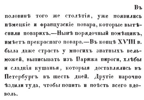 «С середины XVIII века, – пишет В. Похлебкин, – выписка иностранных поваров стала настолько регулярной, что вскоре они почти полностью вытеснили у высшего дворянства русских кухарок и крепостных поваров. Помимо этого, многие состоятельные вельможи и дворяне начинают выписывать из Парижа кондитерские изделия, которые доставлялись в Петербург или Москву через неделю. Некоторые даже специально ездили в Париж попить и поесть…»[101]
