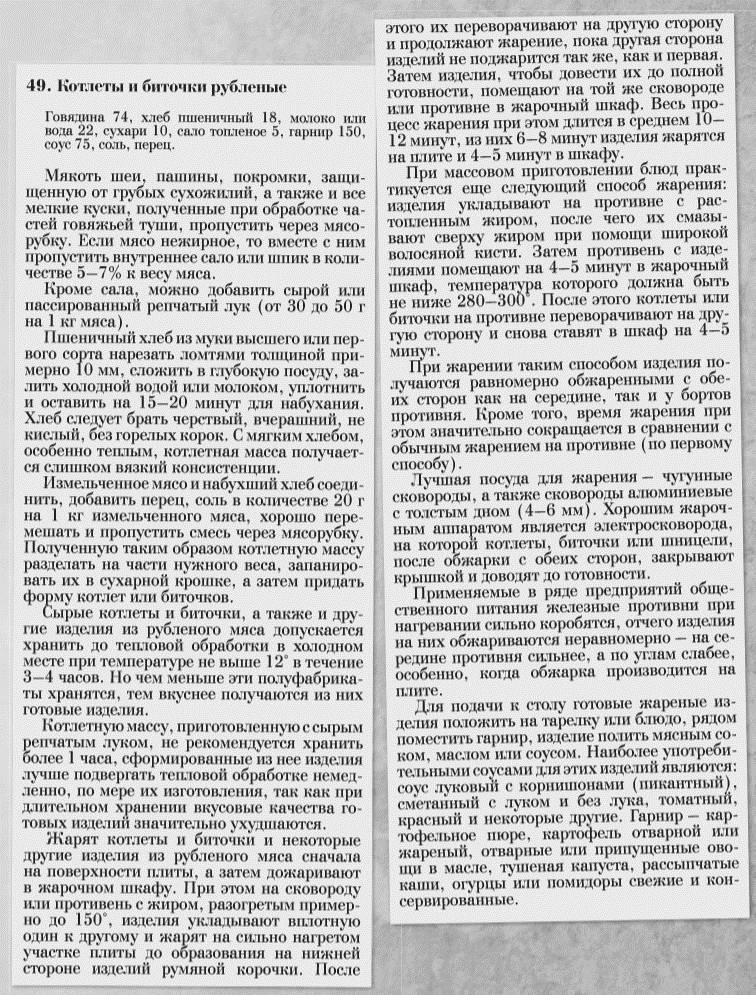 Другое классическое советское горячее – котлеты и тефтели. Наверное, сколько хозяек, столько и семейных рецептов. А вот что касается столовых, ресторанов, производства полуфабрикатов – тут все строго, по «Сборнику рецептур…», никакой самодеятельности. Приведенный на предыдущей странице фрагмент из книги «Мясные блюда», вышедшей в серии «Библиотека повара» в 1958 году, ярко демонстрирует эти советские порядки. Котлеты, биточки, шницели, бифштексы, зразы и тефтели – все это блюда прежде всего из рубленого мяса, фарша.