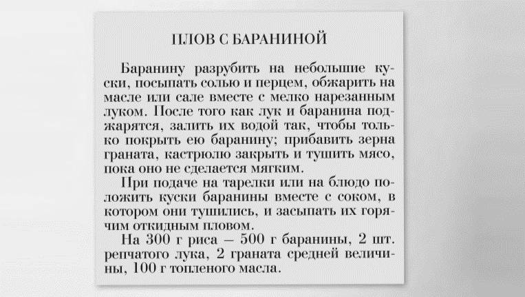 Возвращаясь к теме «советского-многонационального», не можем пройти мимо воспоминаний о двух блюдах. Одно из них, конечно, Узбекский плов. В предыдущих главах, рассказывая о Кариме Махмудове, мы приводили настоящий подробный рецепт этого кушанья. Давали и те странные рецепты плова, которые публиковались в других изданиях. Вот, например, такой (из КВЗП, 1939 года):