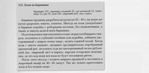 Или несколько более детальный – из книги «Мясные блюда» (Библиотека повара), 1958 года выпуска. Он, в принципе, и являлся типовым общепитовским образцом, по которому готовили плов в столовых по всему СССР (ну, за исключением Средней Азии, где по понятным причинам рецепт был свой):