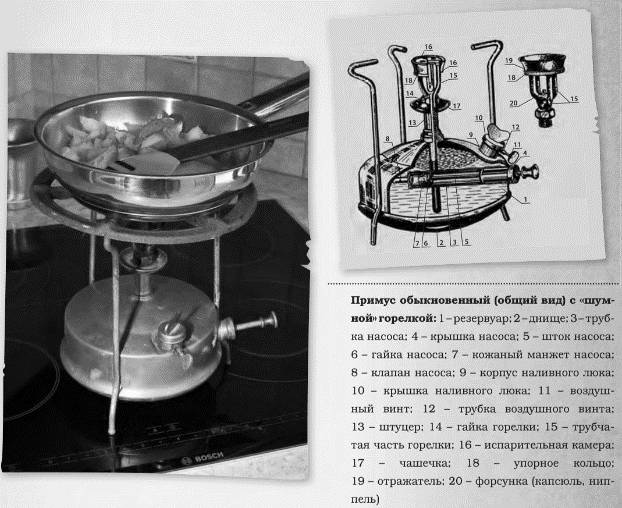 Известный нам сегодня только по книгам и фильмам примус был шагом вперед по сравнению с керосинкой. Работал он так же, на керосине, но уже без чадящего фитиля. Для его розжига требовалось с помощью небольшого насосика слегка накачать давление в камере с топливом. Затем прогреть горелку на пламени (для этого спирт наливался в небольшую чашечку и должен был выгореть полностью). И только после этого, открыв подачу топлива, можно было разжечь горелку. Но даже при этих сложностях примус позволял легче регулировать силу пламени, был более удобен в обращении. Однако с кулинарной точки зрения все это было просто ужасно. Да, эти приборы относительно быстро нагревали посуду. Но в них практически невозможно было осуществить большинство поварских приемов – пассерование, припускание, тушение. К этому добавлялось и то, что примус не мог работать более 1,5 часа (перегревался и становился взрывоопасным). Так что технический прогресс сопровождался ассортиментным и качественным сокращением кулинарии.