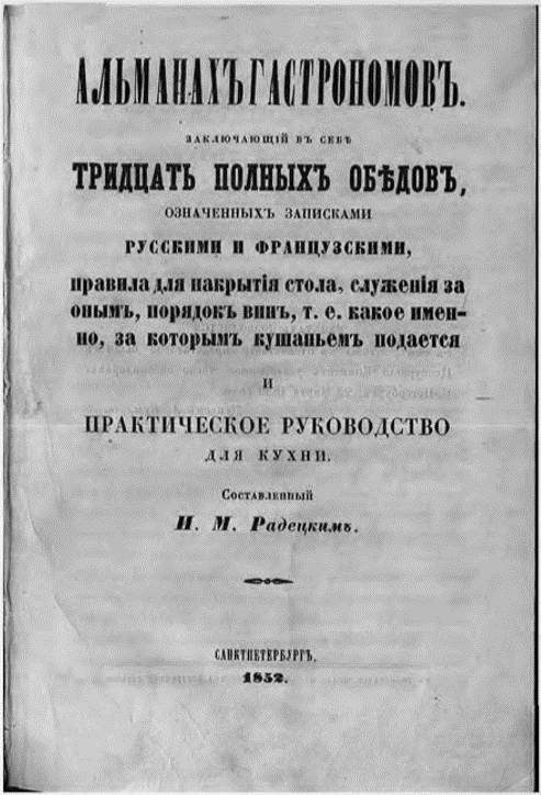 Три тома «Альманаха гастрономов» Игнатия Радецкого вышли в 1852–1855 годах в Санкт-Петербурге. Им также были выпущены книги «Хозяйка, или Полнейшее руководство к сокращению домашних расходов» и «С.-Петербургская кухня» (1862)