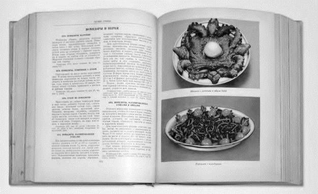 Вместе с тем, конечно, выпущенная в 1955 году «Кулинария» была монументальным трудом. Около 1000 страниц, огромное количество качественных фотографий блюд, столов, интерьеров – все это создавало совершенно сказочную картину советской кухни. Сказочную, не потому что не соответствующую действительности. Просто читатели рассматривали ее во многом так же, как сегодня барышни листают глянцевые модные журналы: «Вот она, настоящая жизнь, ведь и так бывает». Думать о том, что все это где-то рядом, было приятно и немножко волнительно. Так же, как покупать в киоске фотографии артистов 1950-х – Баталова, Рыбникова, Урбанского – и мечтать, мечтать, мечтать…