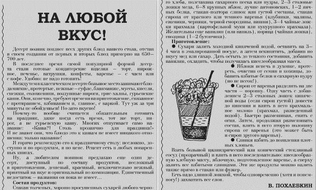 В современной литературе есть множество отзывов о тех или иных ошибках, содержащихся в рецептах Похлебкина. Что здесь сказать? Думается, все имело вполне житейское объяснение. Выдающийся эрудит и энциклопедист, Вильям Васильевич все-таки никогда не имел ни поварского образования, ни сколько-нибудь систематической кулинарной практики. Более того, обстоятельства его жизни не сильно способствовали этому. Есть немало свидетельств[61] того, что практически до середины 1980-х годов Похлебкин жил весьма бедно, перебиваясь порой с каши на чай. Отсюда, возможно, эта его любовь к простым блюдам русской кухни, в приготовлении которых он действительно при близился к совершенству. Но это имело и другое следствие. Как вы думаете, часто ли он мог готовить у себя осетрину, хорошее мясо, приобретать дорогие специи и продукты национальных кухонь? Вот почему теоретически верные его умозаключения в приложении к конкретным блюдам порой давали сбой. Все-таки кухня – это не место черно-белых суждений (это – правильно, а вот это – нет). И любые советы ценны тогда, когда повар сам «набил шишки» с тем или иным блюдом, приготовил его десятки раз, зная о всех возможных неожиданностях с данным продуктом. Ряд же ошибок и неточностей в описании иностранных продуктов еще более понятен, – время было такое.