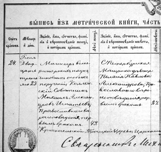 Выписка из метрической книги от 23 июля 1900 года. «жених – магистр ветеринарных наук, чиновник особых поручений, коллежский советник Михаил Александров Игнатьев, православного вероисповедания, 49 лет», «невеста – санкт-петербурская мещанка, девица Пелагiя Павлова Александрова, православного вероисповедания, 27 лет»