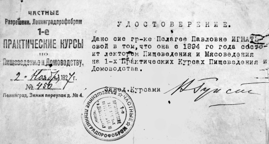 Даже в 1927 году Пелагея Павловна продолжает трудиться по специальности. На 1-х Практических курсах по пищеведению и домоводству в Ленинграде. Обратите внимание на подпись. Да-да, та самая Вера Гунст, которая возглавляла эти курсы и до революции. 35 лет на этой должности – при всех режимах! Вот это верность профессии.