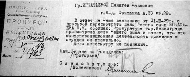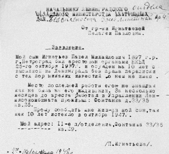 В 1937 году был арестован сын Пелагеи Павловны – Павел. Да-да, тот самый маленький Павлик, который стоит насупленным на фотографии 1906 года). Уж как она боролась за него! И тогда, и спустя 10 лет, когда срок заключения вроде бы истек. Снова и снова она обращается к властям – в прокуратуру: «Мой сын арестованный органами НКВД… Осужден на 10 лет с высылкой из Ленинграда без права переписки… никаких сведений нет».