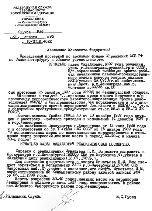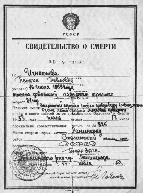 Вот только уплотнили квартиру за это время. И вся семья – Михаил Федорович (внук М. Игнатьева) с женой и дочкой, и Михаил Михайлович с женой и Пелагеей Павловной – все они стали ютиться в паре комнат. «Бабушка Поля жила в маленькой комнатушке при кухне, где раньше жила прислуга», – вспоминает наша собеседница. В 1952 году они стали снимать в поселке Песочный под Ленинградом верхнюю часть дома – 2-й этаж. И Пелагея Павловна вскоре переехала туда. Где через год умерла от последствий перелома шейки бедра.