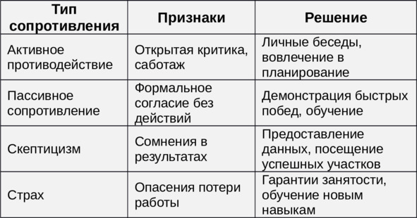 Особенно часто этот барьер встречается на успешных предприятиях. Сотрудники не видят необходимости в изменениях, потому что текущая система кажется им эффективной.