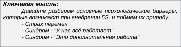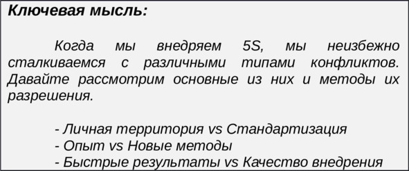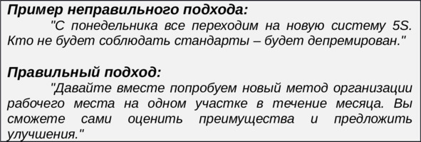 На заводе опытный наладчик, проработавший 30 лет, категорически отказывался от внедрения системы 5S на своём участке. «Я всю жизнь так работал и всегда находил нужный инструмент. Зачем мне ваши новые порядки?»